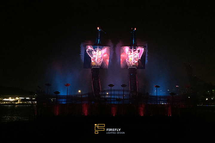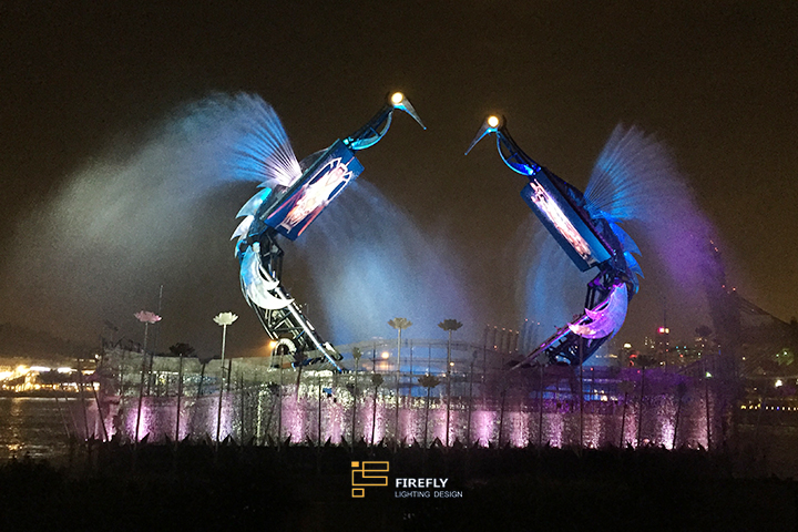 該水舞秀采用突破性視聽技術(shù),結(jié)合燈光流水效果,完美刻畫出仙鶴的優(yōu)雅求愛之舞。巨大鐵鶴在水體幻影及離煥光效中靈巧翱翔,讓人為之驚嘆不已。