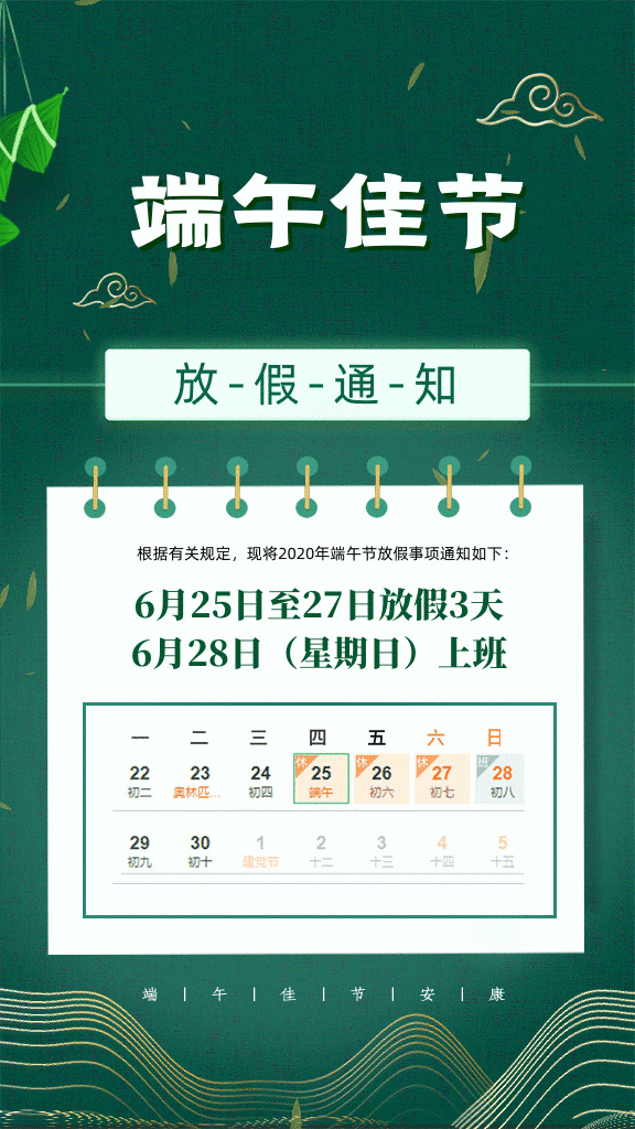 根據(jù)國(guó)務(wù)院辦公廳通知精神,天下通商貿(mào)2020年端午節(jié)放假安排通知如下: